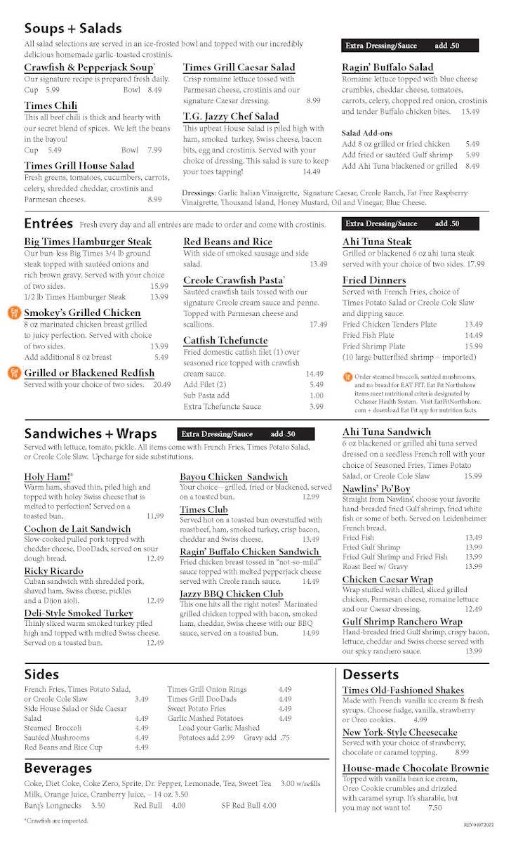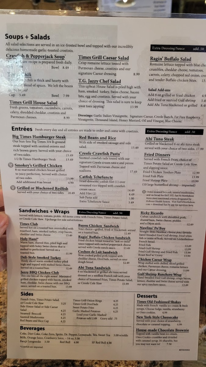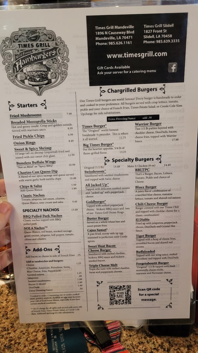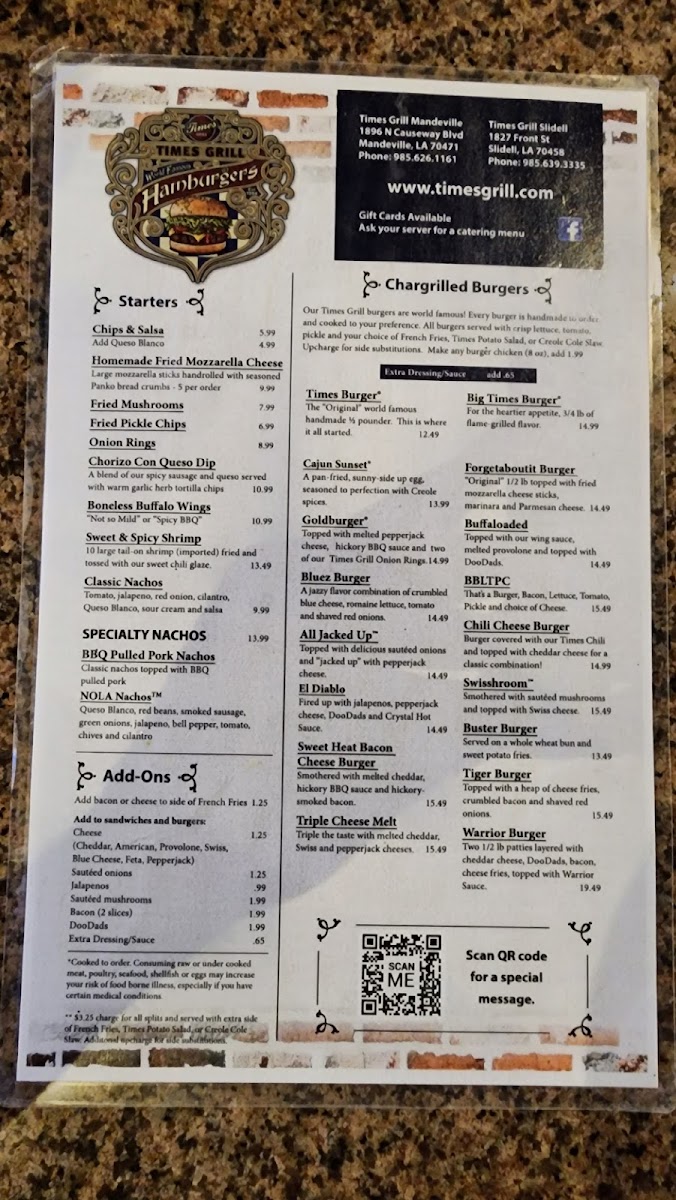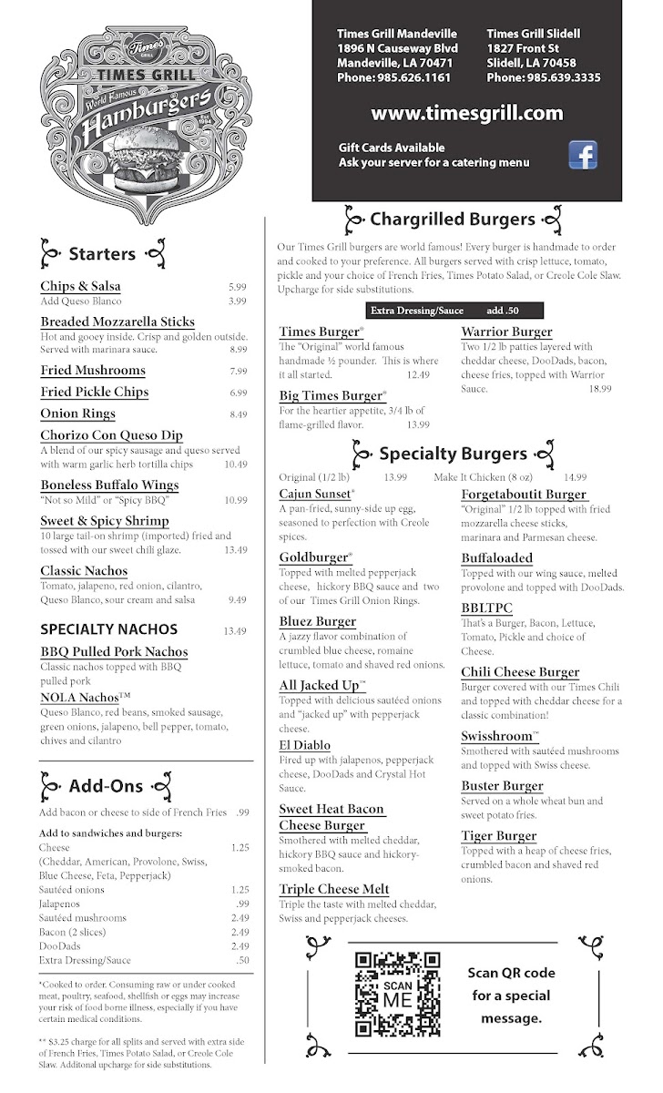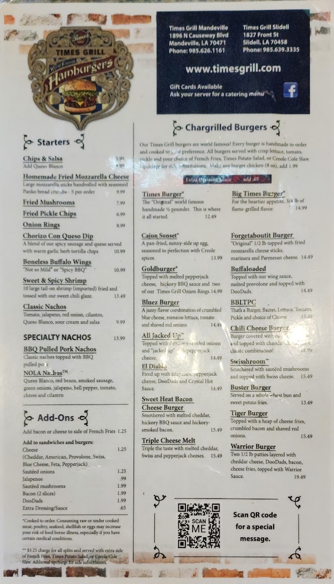 Welcome to Times Grill, an inviting culinary gem located at 1827 Front St, Slidell, LA. This vibrant eatery offers a menu bursting with flavor and variety. Indulge in hearty starters like the Chorizo Con Queso and Sweet & Spicy Shrimp, perfect for whetting your appetite. For a fulfilling meal, try the Ragin' Buffalo Salad with its crunchy romaine and tender Buffalo chicken bites, or the classic Times Burger, praised for its outstanding taste.